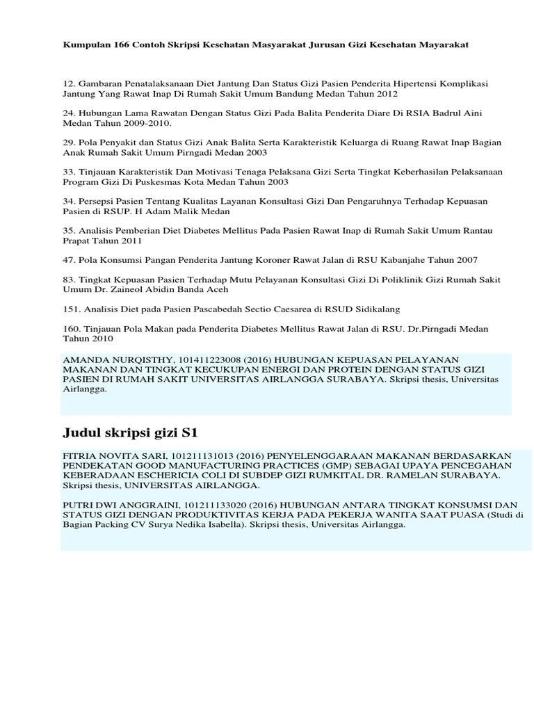 Nama mahasiswa nomor induk mahasiswa. Pola konsumsi makanan penderita penyakit kardiovaskular di rumah sakit abc tahun xx. Daftar judul skripsi angkatan iii 22 okt 2011. Kumpulan judul skripsi riset keperawatan. Efekvititas pelayanan gizi pada posyandu dan. Judul penelitian nama mahasiswa halaman persetujuan : Skripsi merupakan syarat wajib ditempuh oleh mahasiswa semester guna mendapatkan gelar kesarjanaan. 5 contoh judul skripsi sosial / penelitian sosial. Memang ada website yang sangat menjanjikan sebagai sumber referensi skripsi yang terbaik yaitu. Obesitas sentral berhubungan dengan toleransi glukosa terganggu pada remaja perempuan. Contoh judul penelitian, skripsi, thesis bidang gizi yang terbit di jurnal gizi semoga dapat memberi inspirasi untuk mencari masalah penelitian…….moga bermanfaat. Semua judul ini sangat cocok untuk jurusan manajemen keuangan dan akuntansi. Judul kti mahasiswa jurusan gizi judul hubungan asupan zat gizi dengan status gizi ibu hamil di puskesmas baamang unit i sampit kabupaten kotawaringin timur doris sylvanus palangkaraya peminatan gizi klinik tahun 2004 jurusan gizi.